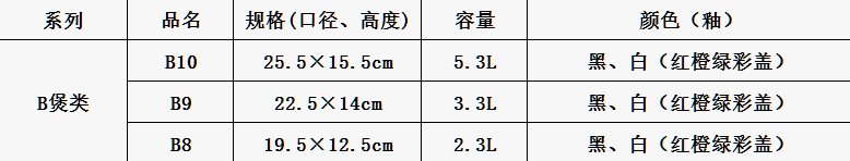 B煲类:采用了高温釉烧的工艺,易清洗,更耐用;桶形的煲身迅速在锅身内聚形成高温循环,热量均衡,储能保温,加热烹煮中释放远红外线使食物均匀受热,食材更易软烂入味;可用于煲汤、熬粥、炖菜等,让菜肴保持原汁原味,口感原香细腻。