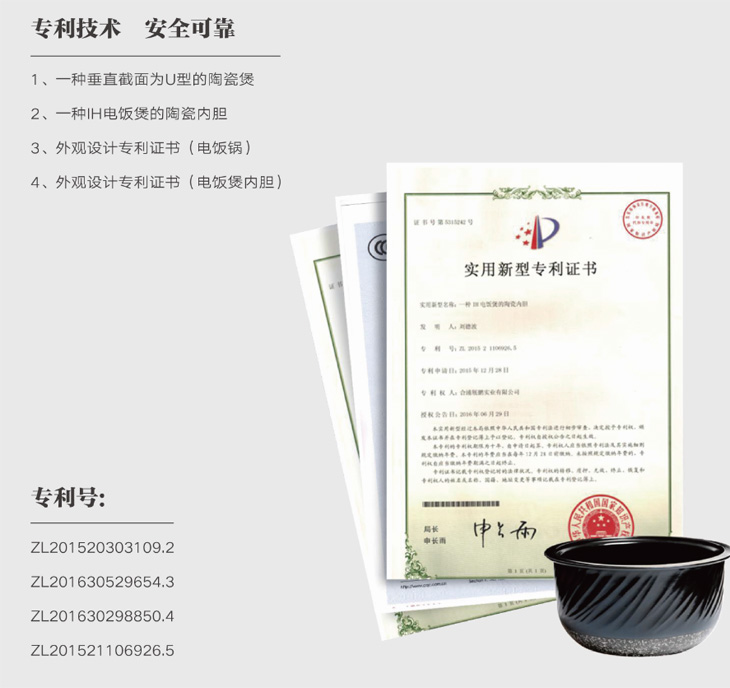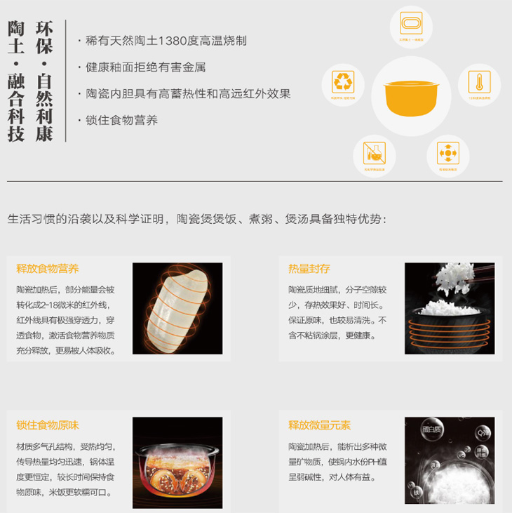 陶瓷内胆具有高畜热性和高远红外效果,激活食物营养原生陶釜,结合IH技术,天然陶土,健康釉面,1380度烧制。