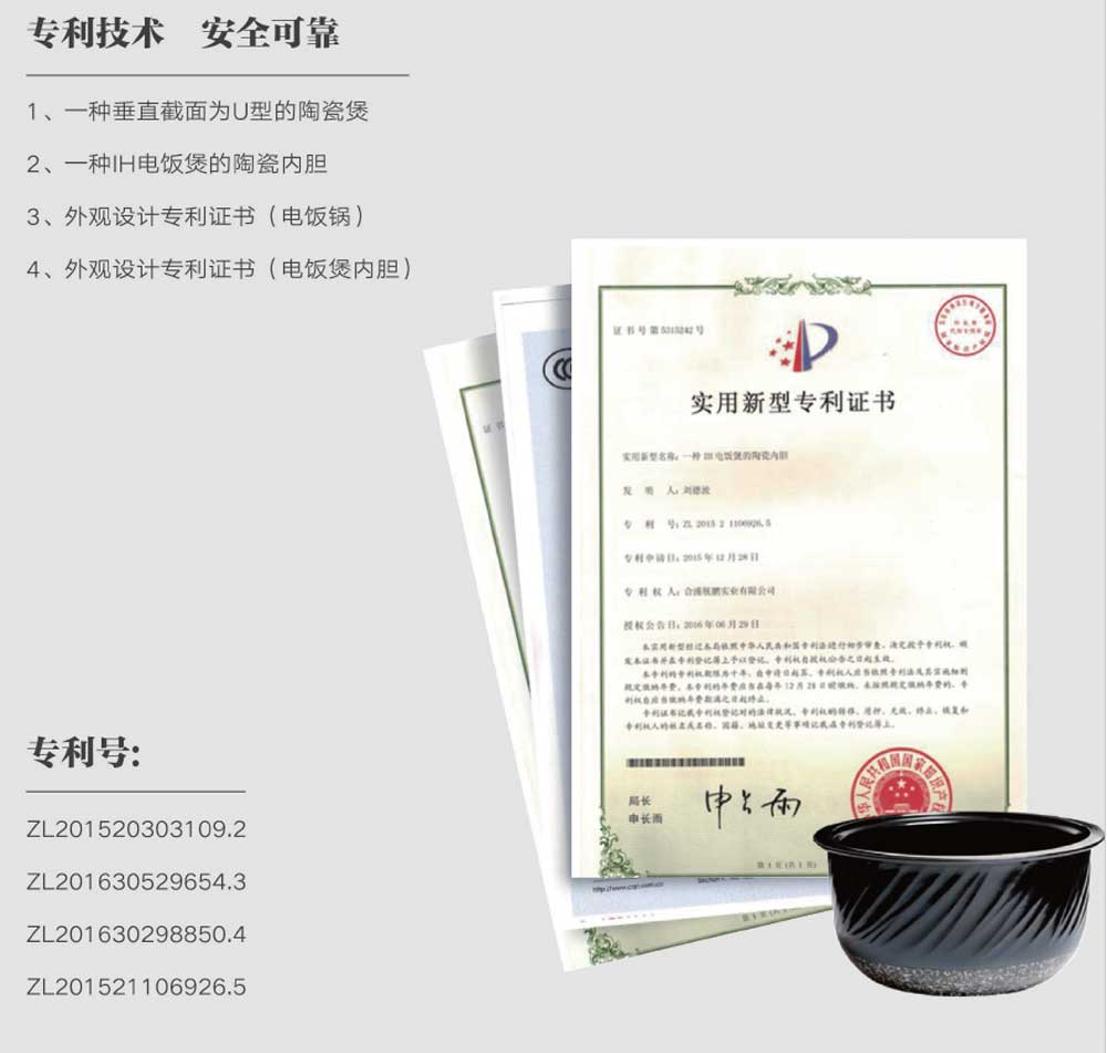 最新研发品牌-“利康鼎煲”电饭煲坚持自主研发及持续创新,拥有多项发明专利、实用新型专利。从健康材质、陶土应用、产品设计、耐热性试验、口感测试等方面持续投入科研力量,结出了丰硕成果。